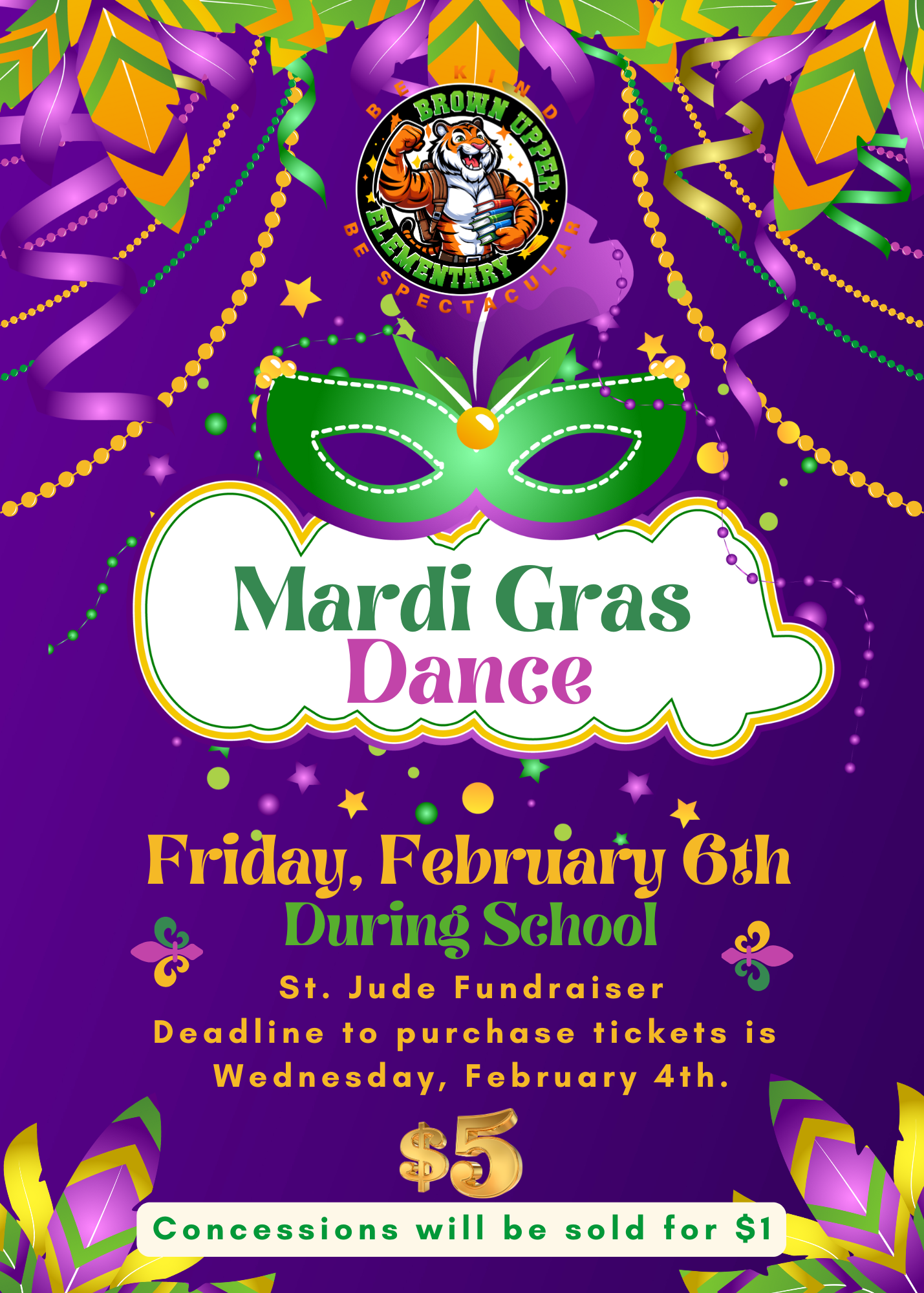 Our Mardi Gras dance is rescheduled for Friday, Feb. 6th. Nacho Day is Wednesday. If you have already purchased tickets for this, it will roll over.Please see the updated deadlines. Mardi Gras Dance Tickets and Nacho Orders must be purchased by Wed. Feb. 4th. The deadline to purchase candy grams is Thursday, Feb. 5th. Tickets to the Talent Showcase on Feb. 5th will be sold at the door and can be purchased online.Thank you in advance for supporting our school's St. Jude Fundraiser events.- Mrs. Flournoy, BUES Principal